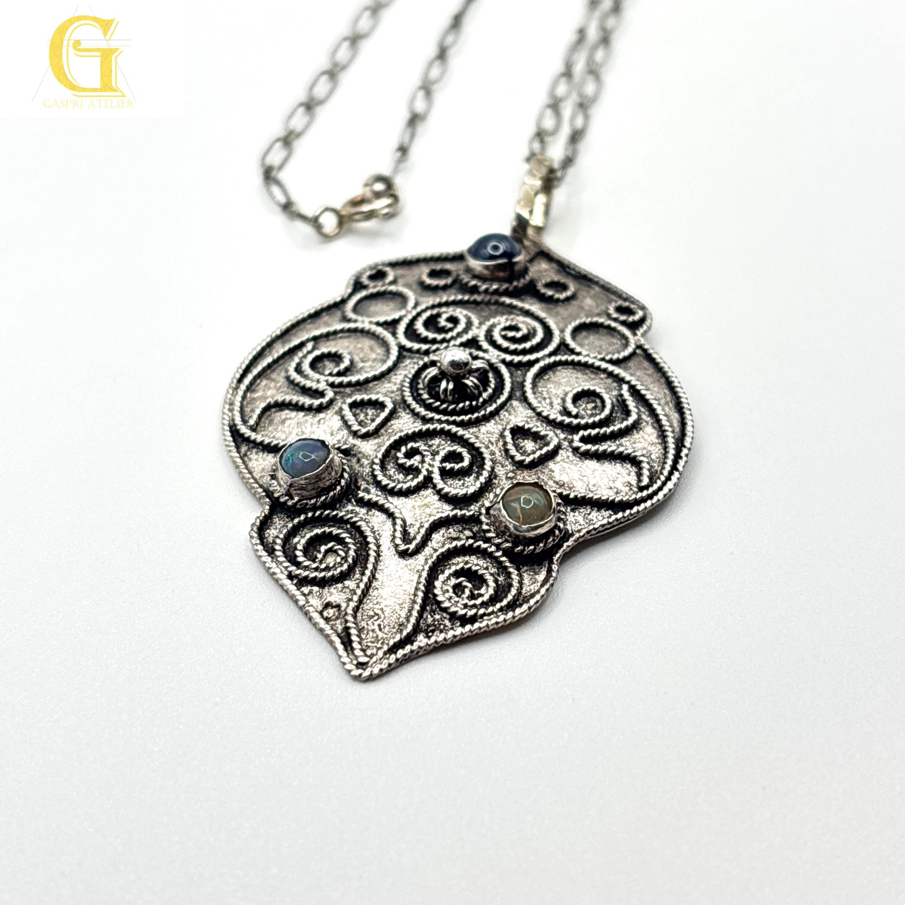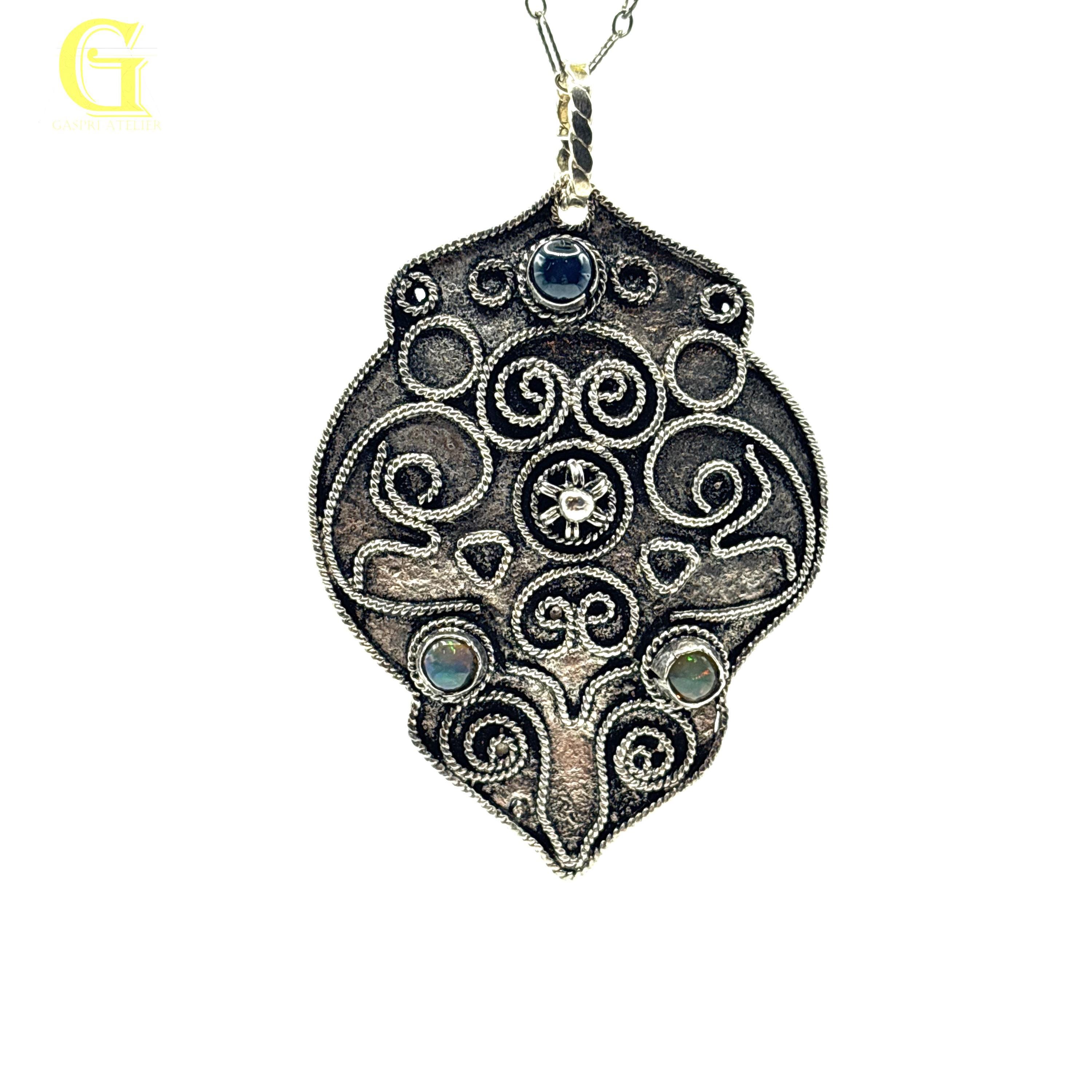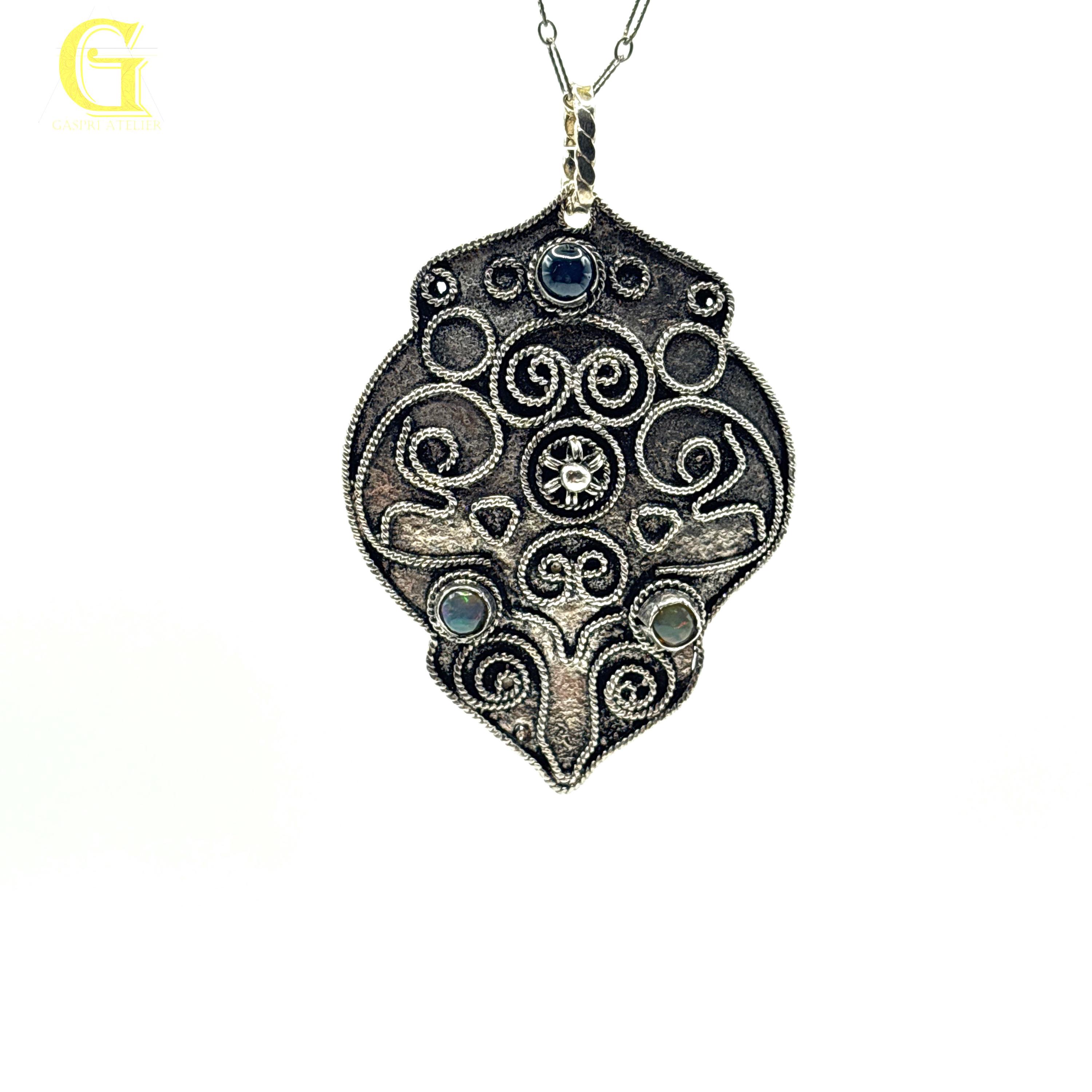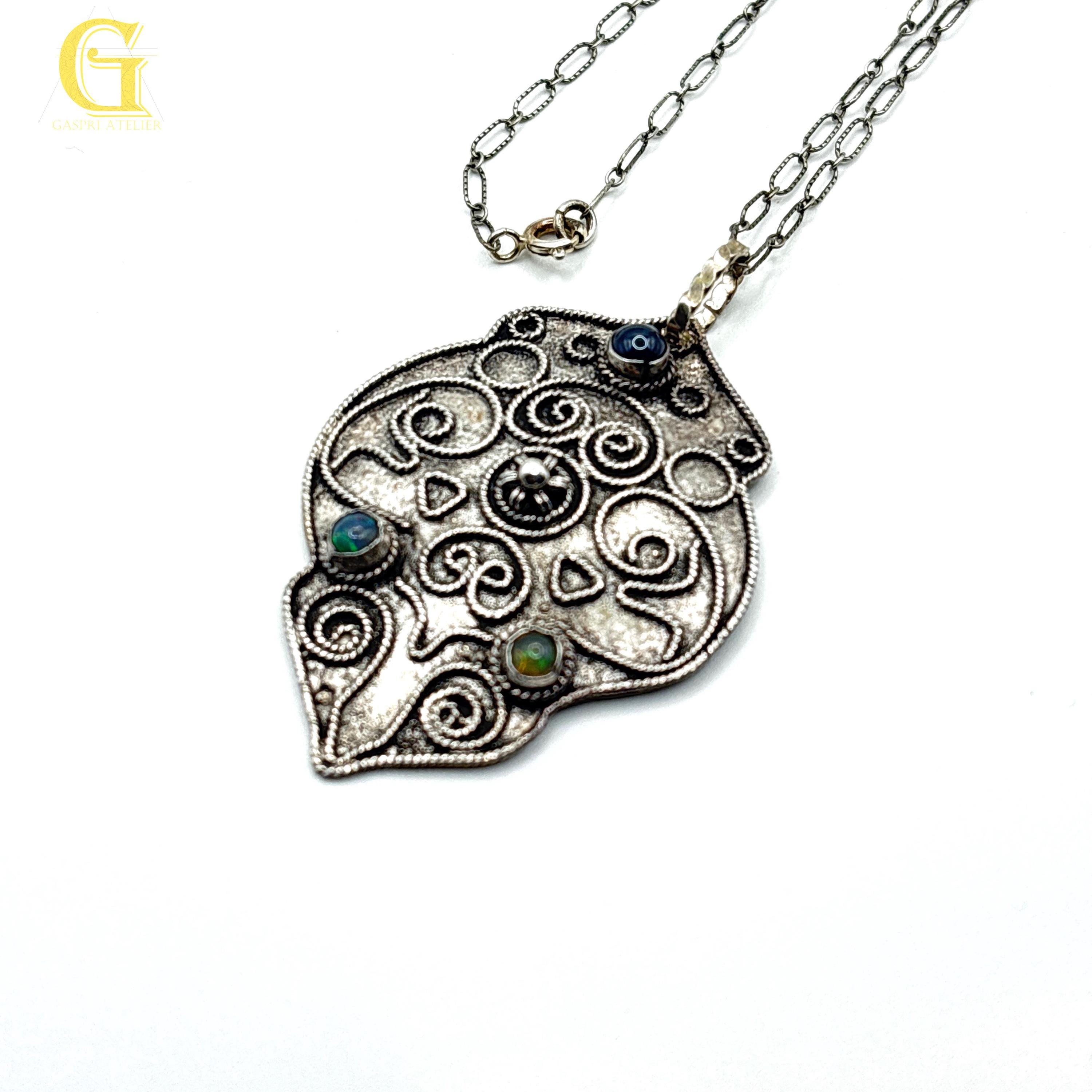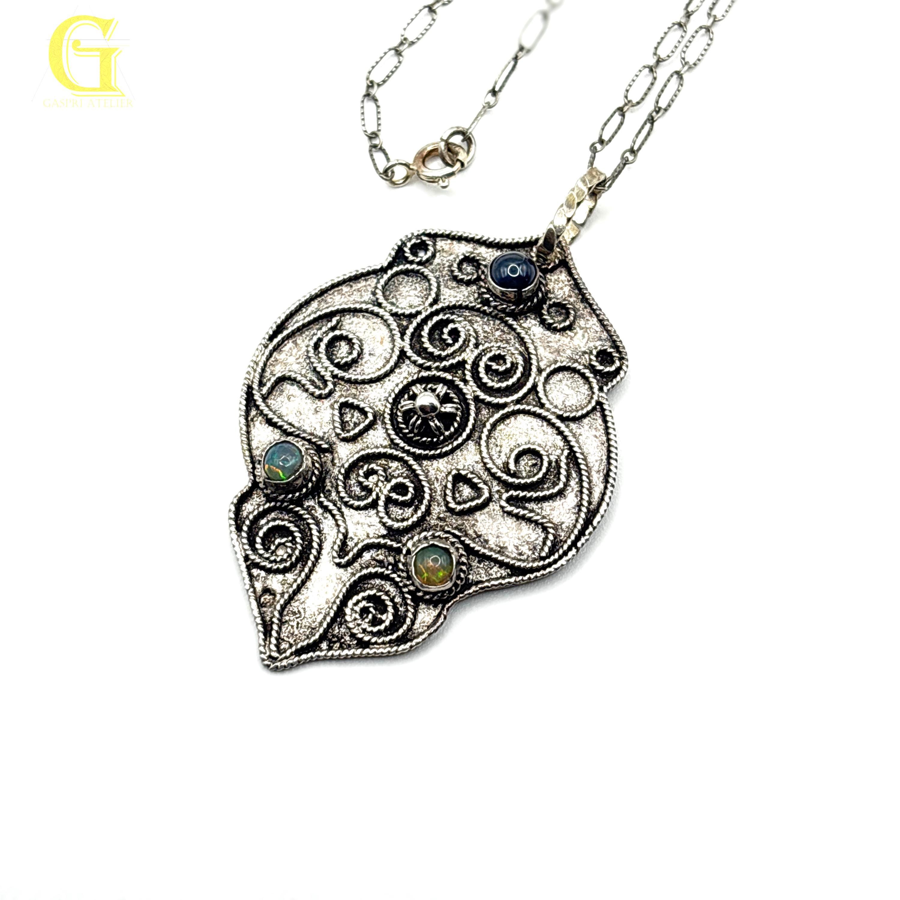 This necklace has a pendant which is a combination of handmade filigree work and combination of gemstones to include Opal and Blue Star Saphire.