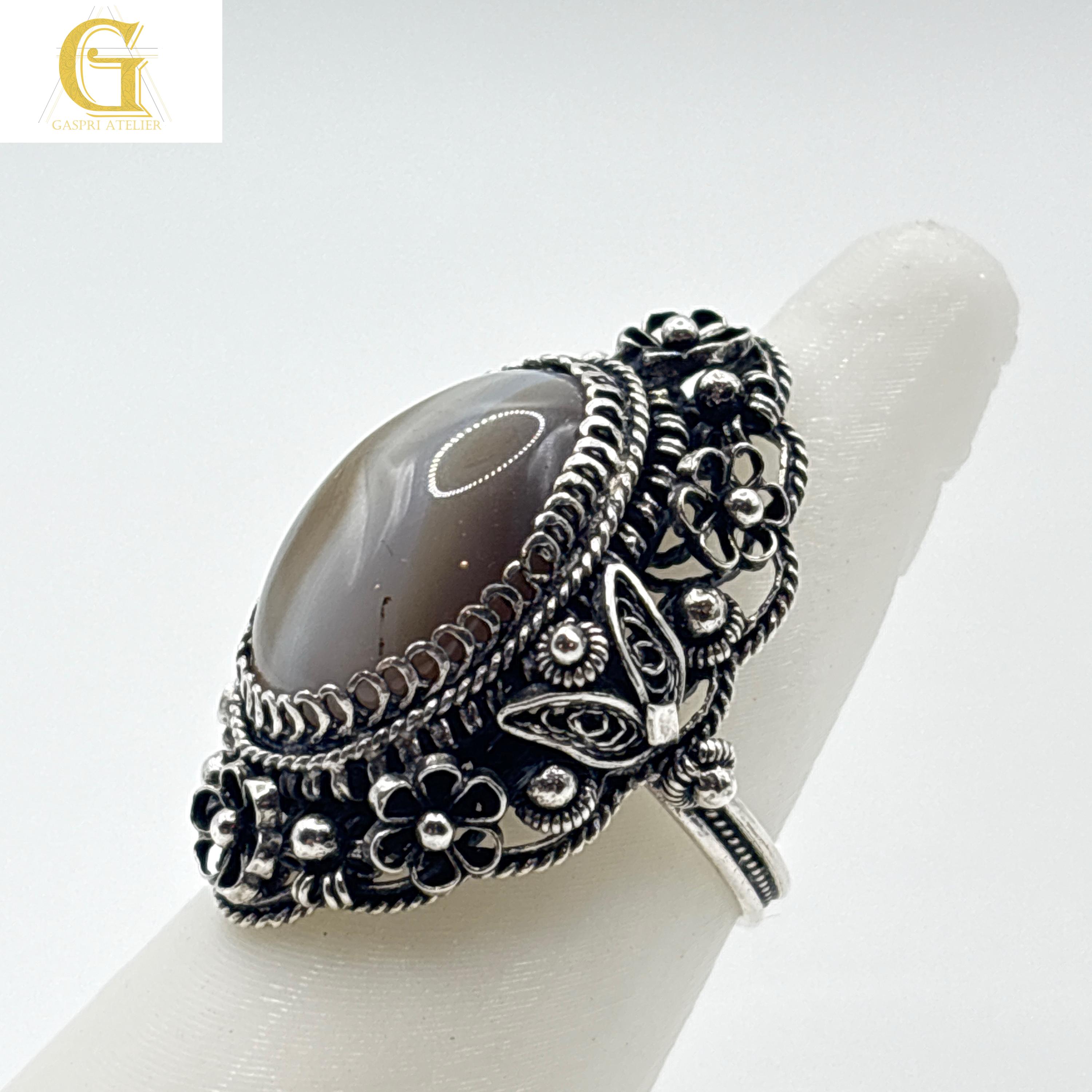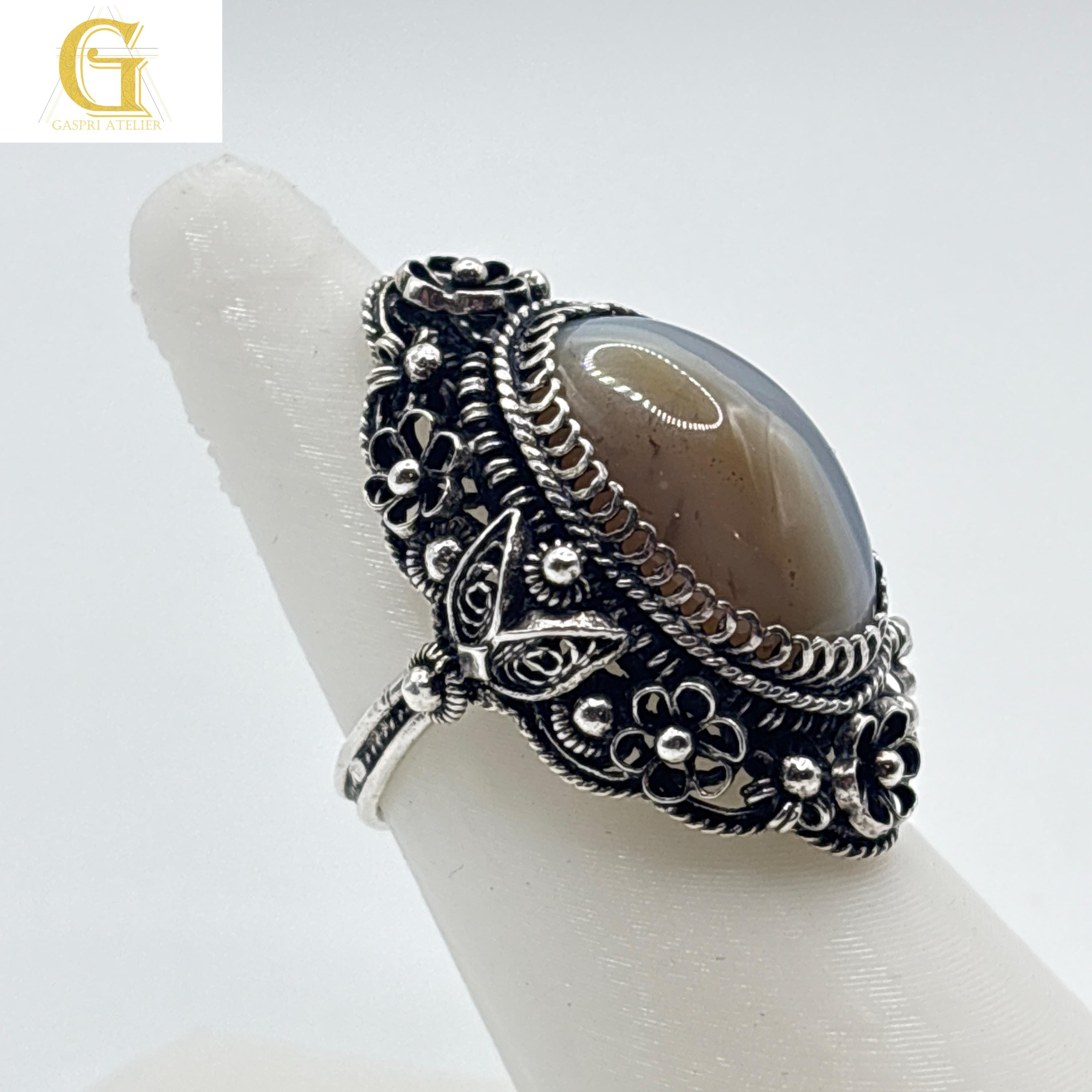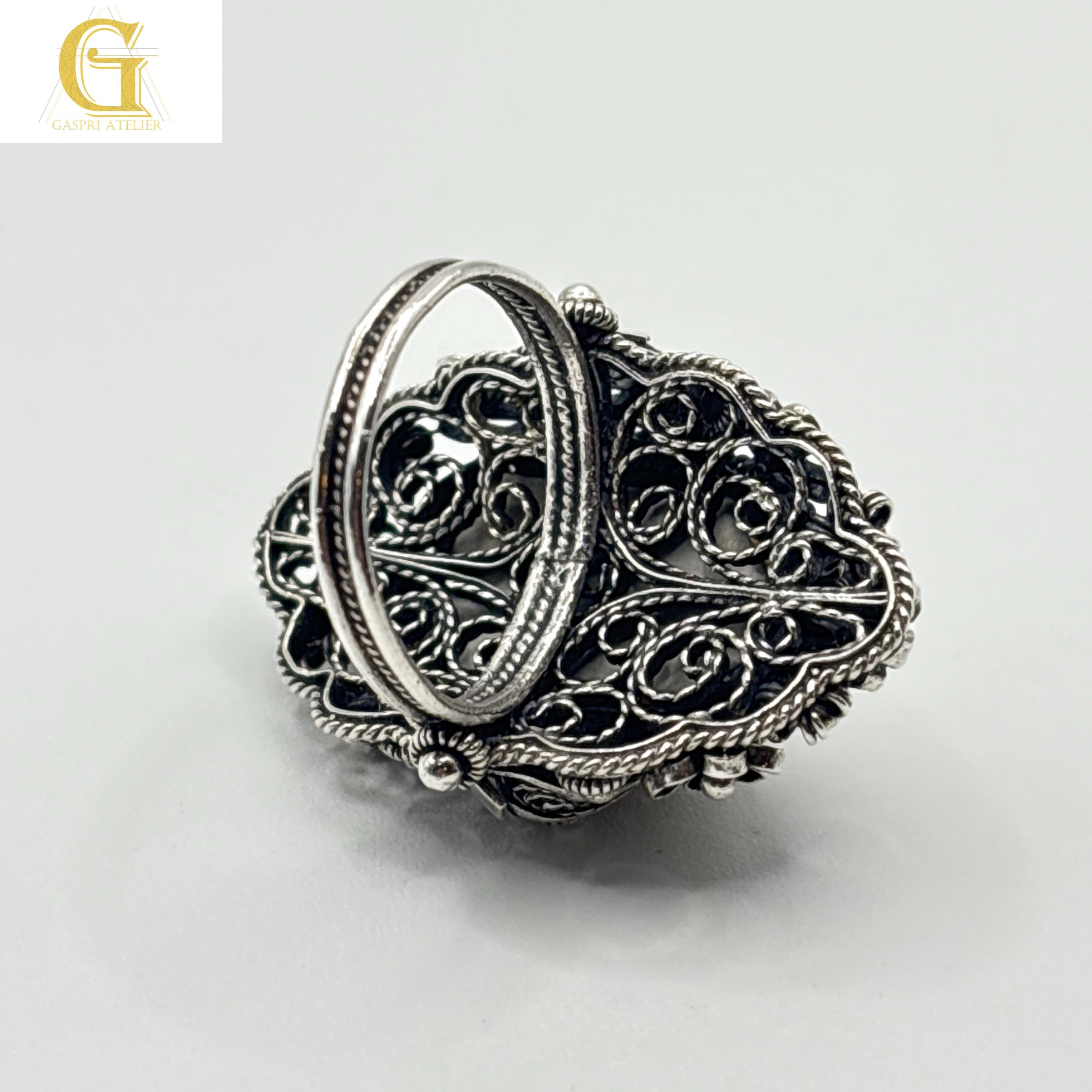 The entire ring is hand made with filigree techniques used by my family's filigree masters. It is a very complex work done with love and care