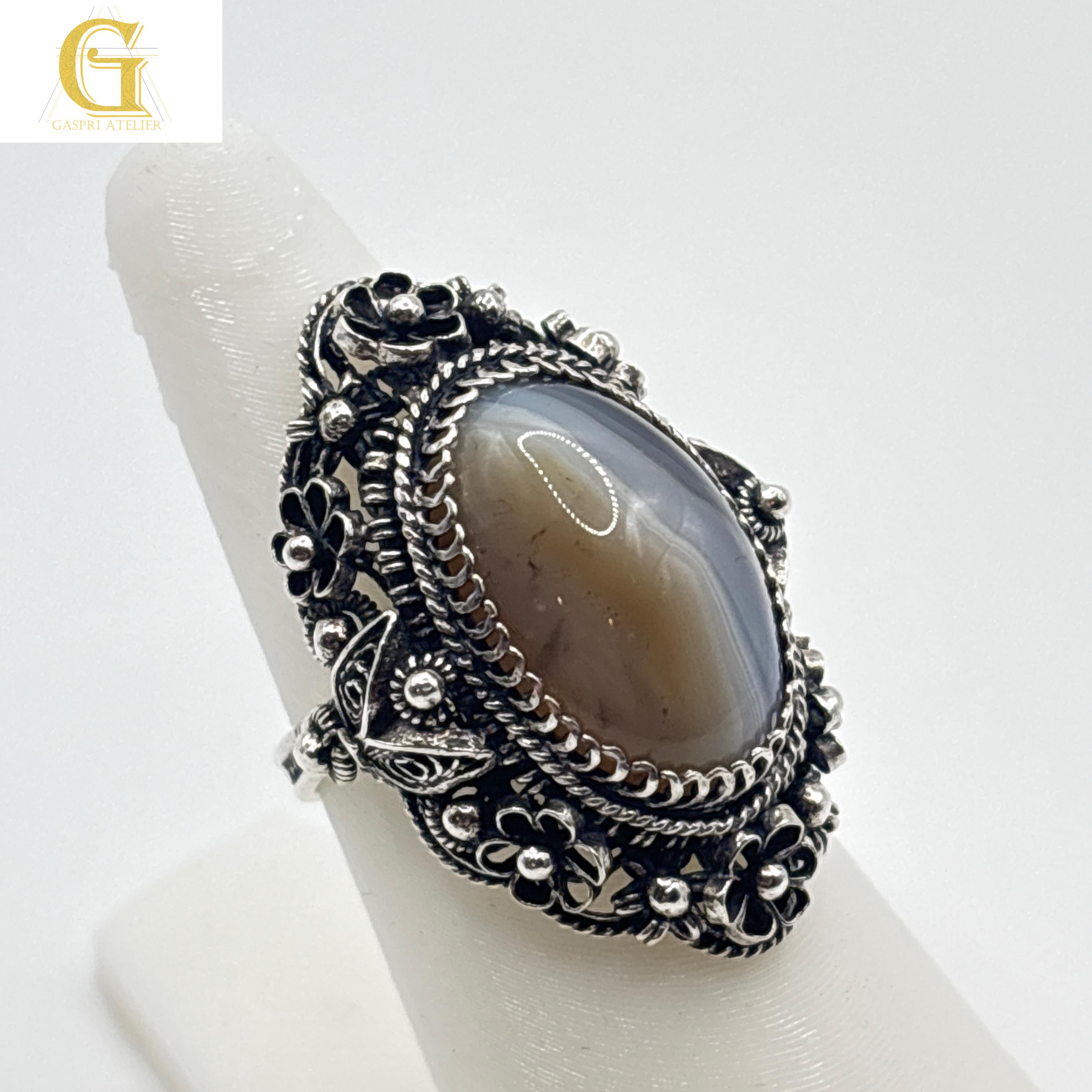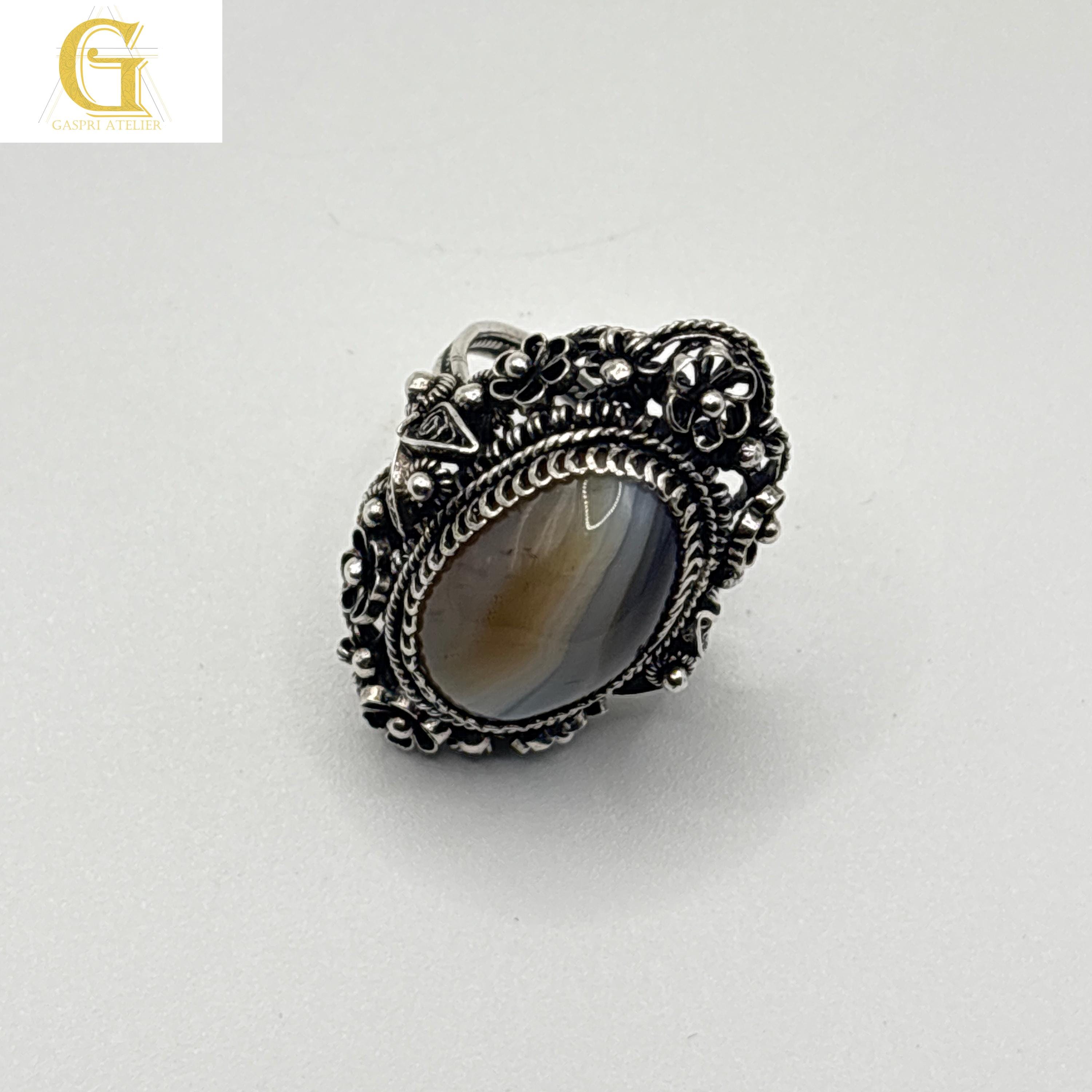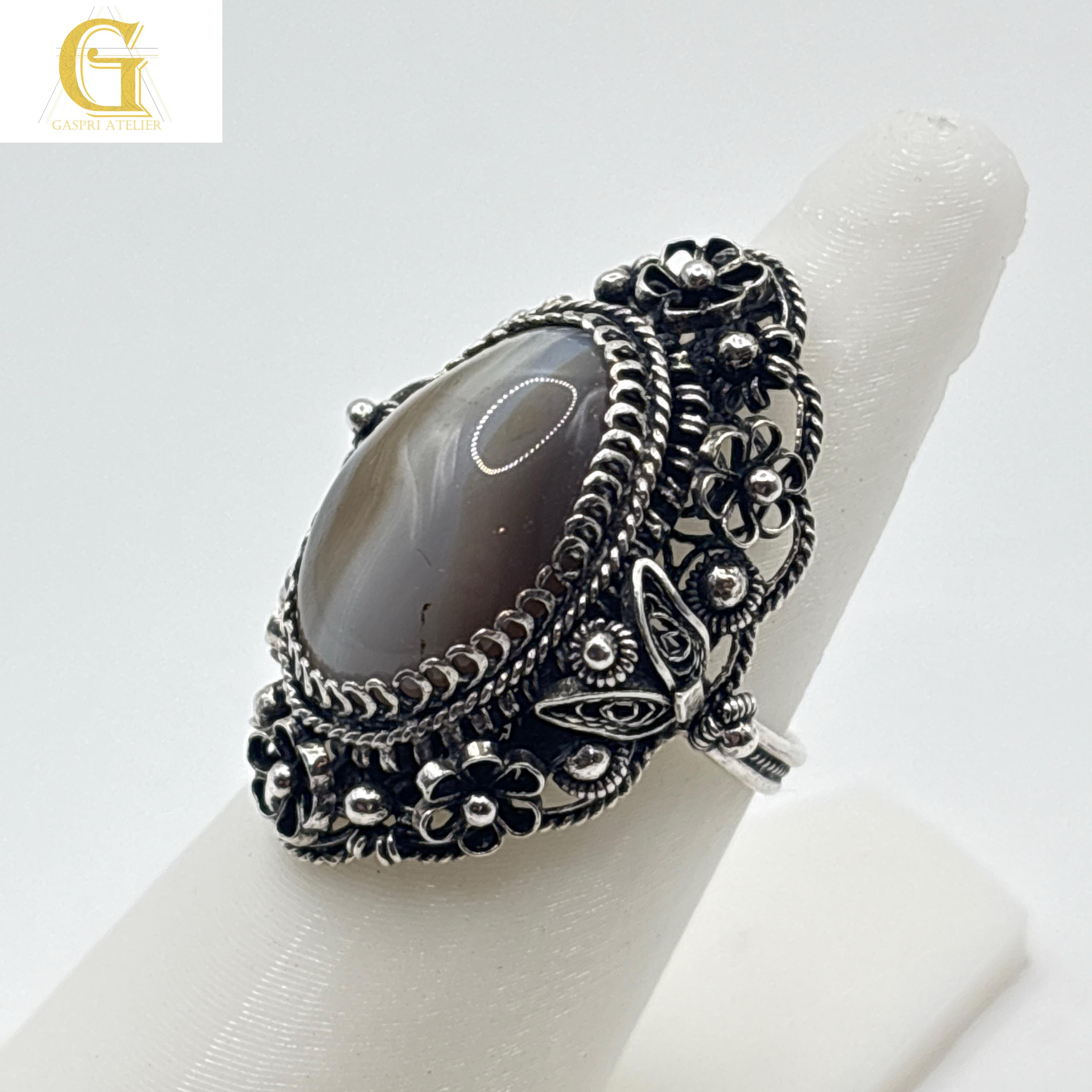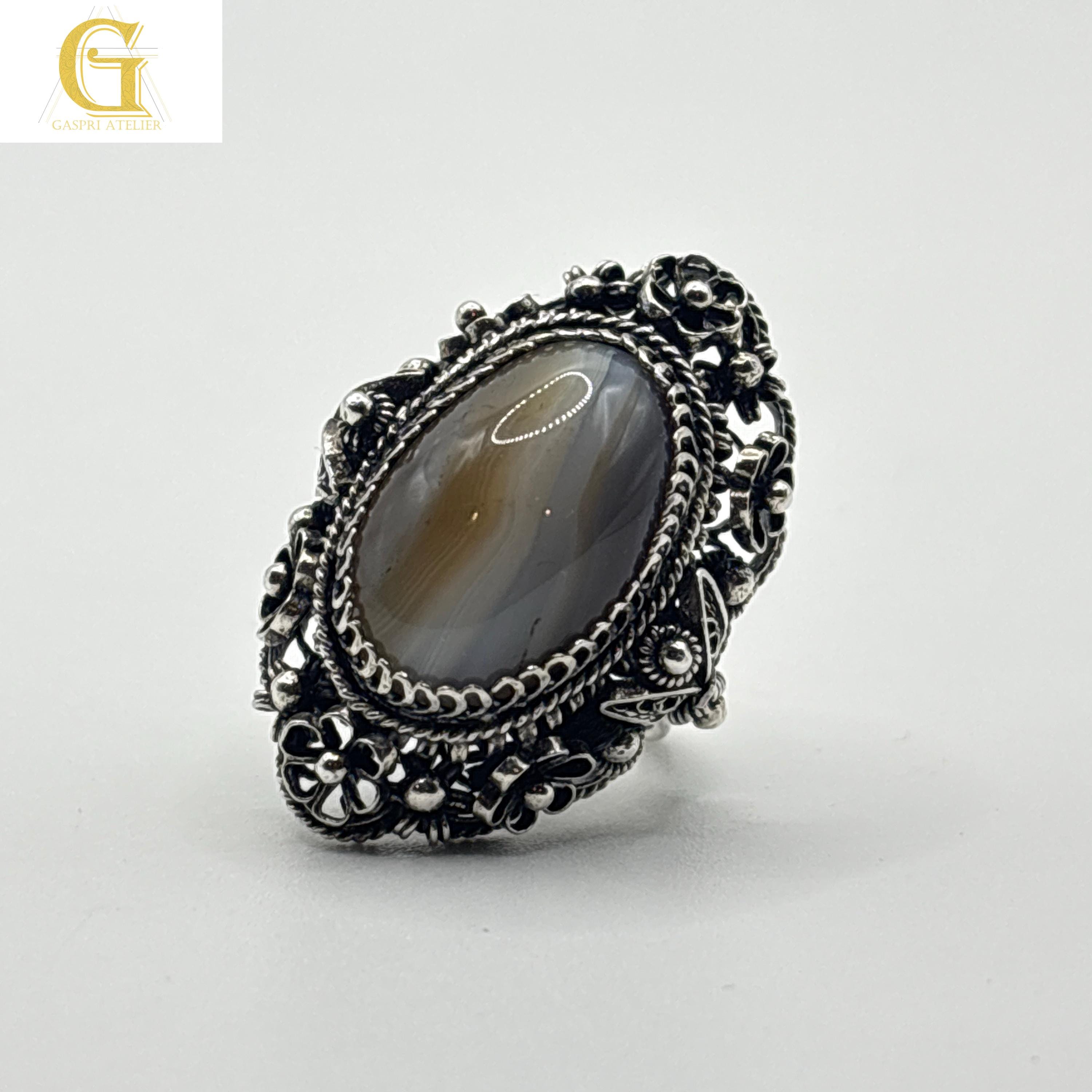 The entire ring is hand made with filigree techniques used by my family's filigree masters. It is a very complex work done with love and care