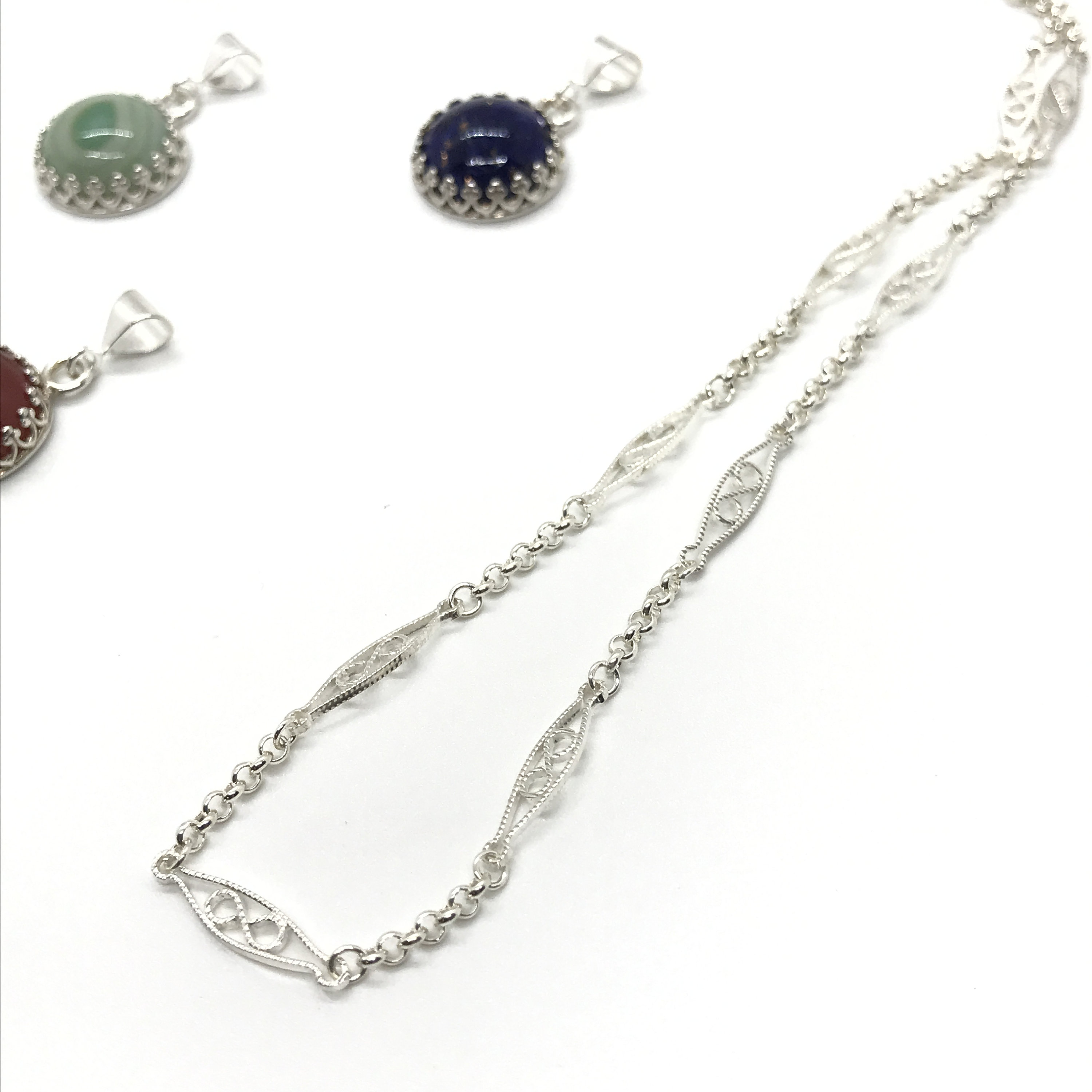 We offer two types of chains for these pendants. One is the more expensive filigree chain and the other one is a foxtail chain.